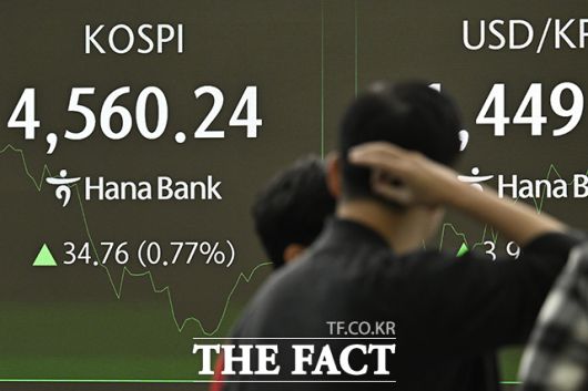 [더팩트 | 송호영 기자] 코스피가 사상 최초로 장중 4600선을 돌파한 7일 오전 서울 중구 하나은행 본점 딜링룸 전광판에 코스피 지수가 표시되고 있다.