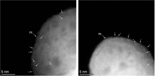 나노입자 형태의 백금은 수소 생산을 촉진하는 뛰어난 촉매 역할을 한다. 값이 비싸 비용 부담이 크다. 입자 내부의 원자들이 화학 반응에 직접 참여하지 않아 효율이 낮다.