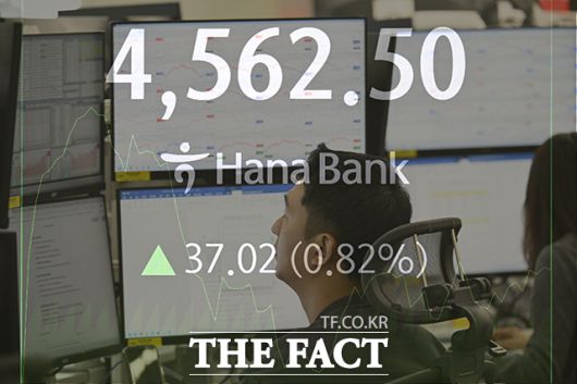 [더팩트 | 송호영 기자] 코스피가 사상 최초로 장중 4600선을 돌파한 7일 오전 서울 중구 하나은행 본점 딜링룸 전광판에 코스피 지수가 표시되고 있다.