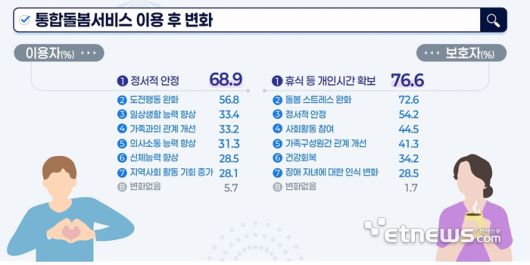 조사 결과, 보호자는 서비스 이용을 통해 △휴식 등 개인시간 확보(76.6%) △돌봄 스트레스가 완화(72.6%) △정서적 안정(54.2%) 등 효과가 있었다고 응답했다.