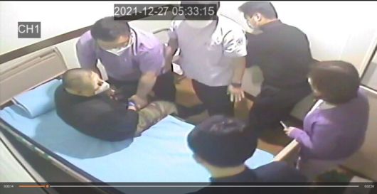 2021년 12월 말 춘천예현병원에 입원했다가 251시간 50분간 격리·강박당한 끝에 사망한 김형진(가명·45)씨의 입원 직후 모습. 간호사와 보호사에 의해 둘러싸여 강박당하기 직전의 모습이다. CCTV 갈무리 |