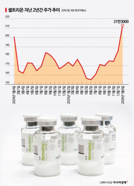 셀트리온 주가가 2년만에 20만원선에 안착했다. 4분기 호실적이 확인되면서 실적 안정성에 대한 의심이 줄었고, 새해 성장 가시성이 뚜렷해지자 시장의 평가는 '할인'에서 '리레이팅(가치 재평가)'으로 옮겨가고 있다.