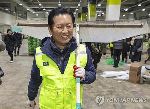 (서울=연합뉴스) 이슬기 오규진 기자 = 더불어민주당 정청래 대표가 7일 아침 새해를 맞아 서울 송파구 가락동 농수산물 시장을 찾아 청소 봉사를 했다.