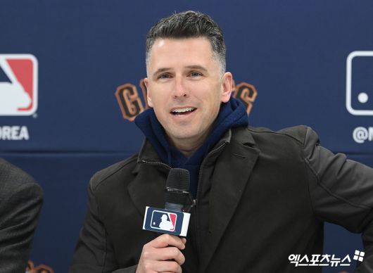 (엑스포츠뉴스 이천, 고아라 기자) 7일 오후 경기도 이천 LG챔피언스파크에서 열린 샌프란시스코 자이언츠 한국 방문 미디어데이, SF 버스터 포지 사장이 인사를 하고 있다.고아라 기자 iknow@xportsnews.com