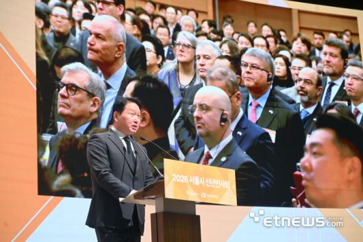 2026 서울시 신년인사회가 7일 서울 중구 대한상공회의소에서 열렸다. 최태원 대한상공회의소 회장이 신년사를 하고 있다. 박지호기자 jihopress@etnews.com [Copyright © 전자신문. 무단전재-재배포금지]