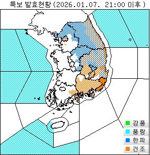 기상청은 7일 정오, 전국 다수 지역에 강풍·풍랑·한파·건조 관련 기상특보를 발표했다. 특보 효력은 7일 밤 9시 이후 적용된다.