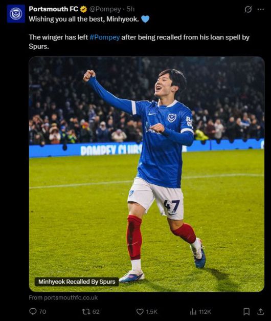 포츠머스는 7일(한국시간) 구단 공식 채널을 통해 "토트넘 홋스퍼가 임대 중이던 양민혁을 복귀시켰다"고 발표하며 결별을 공식화했다.
