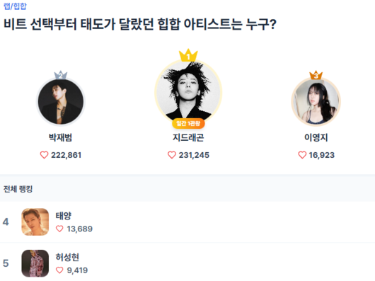 지드래곤과 박재범을 중심으로 한 상위권 경쟁 속에서, 각기 다른 색깔을 지닌 아티스트들이 공존하며 장르의 스펙트럼을 넓히고 있다는 점에서 향후 행보에도 관심이 모인다.