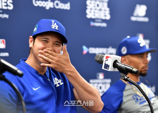 LA 다저스 오타니 쇼헤이가 16일 서울 고척스카이돔에서 진행되는 MLB 서울시리즈 다저스 공식 기자회견에서 결혼관련 질문에 미소짓고 있다. 사진 | 스포츠서울DB |