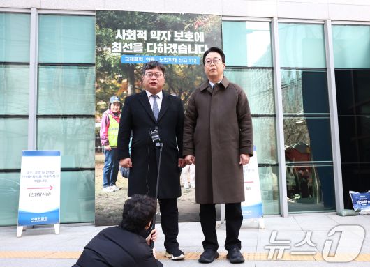 (서울=뉴스1) 김민지 기자 = 국민의힘 법률자문위원회 곽규택 위원장(오른쪽)과 김기윤 부위원장이 7일 서울 종로구 서울경찰청 민원실에서 이재명 대통령과 김민석 국무총리, 정성호 법무부 장관, 박철우 서울중앙지검장에 대해 서해 피살 공무원 사건 관련 직권남용혐의로 고발장을 접수한 뒤 입장을 밝히고 있다. 2026.1.7/뉴스1