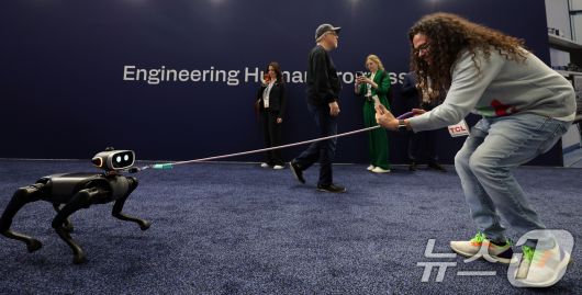(라스베이거스=뉴스1) 황기선 기자 = 세계 최대 IT(정보기술)·가전 전시회 'CES 2026' 개막 일인 6일(현지시간) 미국 네바다주 라스베이거스 컨벤션센터(LVCC)에서 관람객이 목줄을 한 로봇개와 함께 전시장을 누비고 있다. 2026.1.7/뉴스1
