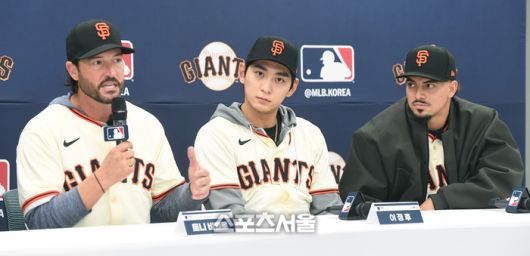 미국 메이저리그 샌프란시스코 자이언츠의 토니 비텔로 감독(왼쪽)과 이정후(가운데), 윌리 아다메스가 7일 경기도 이천 LG챔피언스파크에서 진행된 미디어데이 행사에서 인사말을 하고 있다. 2026. 1. 7.이천 | 박진업 기자 upandup@sportsseoul.com [기사제보 news@sportsseoul.com] Copyright ⓒ 스포츠서울&sportsseoul.com