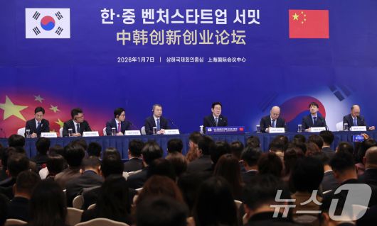(상하이(중국)=뉴스1) 허경 기자 = 이재명 대통령이 7일 중국 상하이 국제회의중심에서 열린 한·중 벤처스타트업 서밋에서 발언하고 있다. 2026.1.7/뉴스1