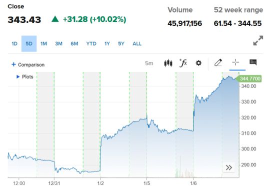 마이크론 주가 추이. 6일(현지시간) 종가 343.43달러. 출처 CNBC |