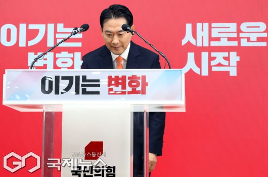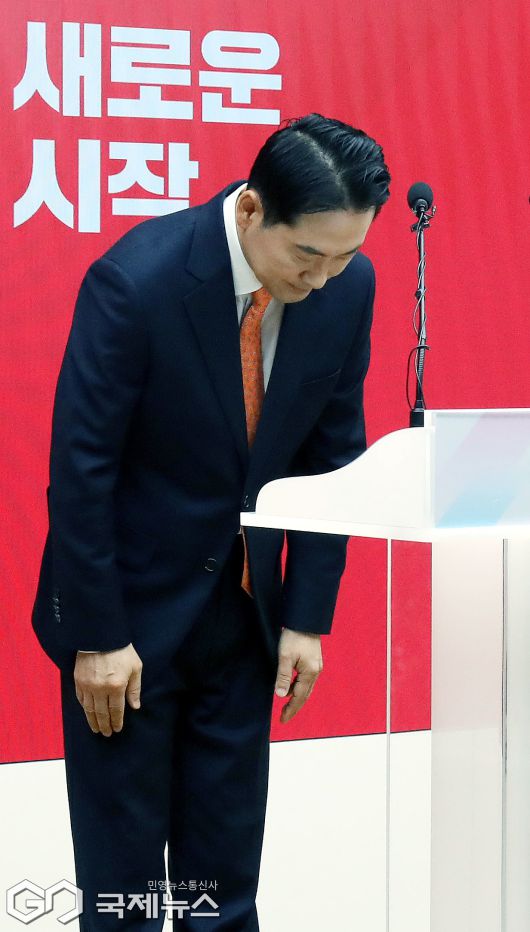 (서울=국제뉴스) 장동혁 국민의힘 대표가 7일 서울 여의도 중앙당사에서 열린 긴급기자회견에서 당 쇄신안 등을 발표하기 전 인사하고 있다./사진=이용우 기자