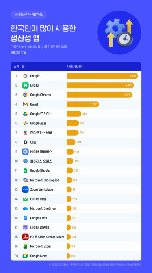 [디지털투데이 황치규 기자]2025년 11월 한국인이 가장 많이 사용한 생산성 앱은 구글이라는 조사 결과가 나왔다.
