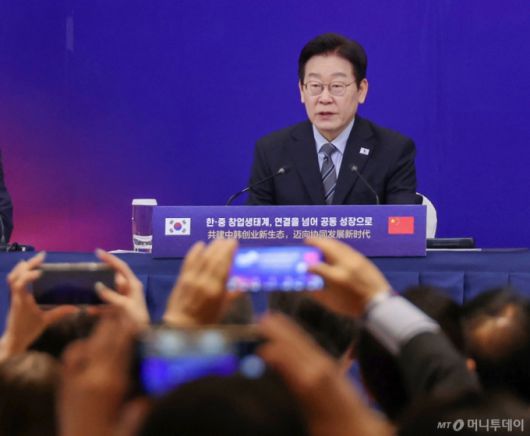 [상하이=뉴시스] 최동준 기자 = 중국을 국빈 방문 중인 이재명 대통령이 7일(현지 시간) 상하이 상해국제회의중심에서 열린 한-중 벤처스타트업 서밋에서 인사말을 하고 있다. 2026.01.07. photocdj@newsis.com /사진= |