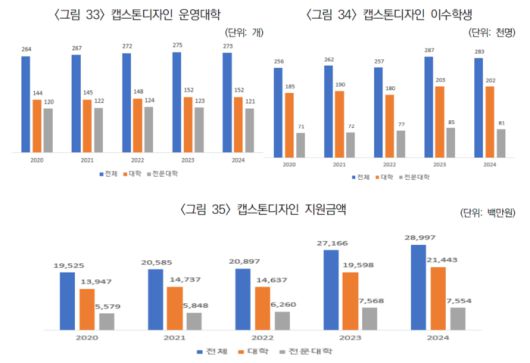 다만, 대학 유형별 격차는 여전히 해결돼야 할 과제로 지적된다. 현장 중심 교육을 강점으로 하는 전문대학은 운영 대학 수와 지원 금액 등이 일반대학과 차이가 크다. 2024년 기준 일반대학의 캡스톤 디자인 지원금은 약 214억원인 반면, 전문대학은 75억5000만원 수준에 머물렀다.