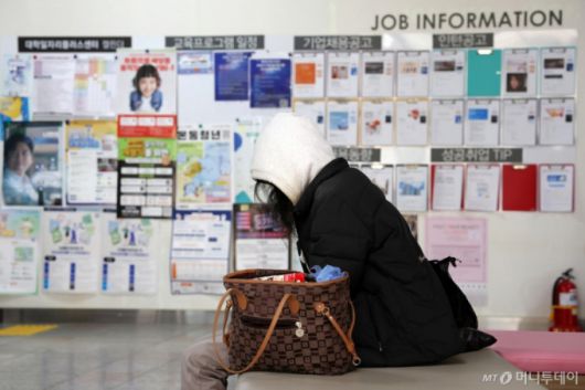 서울 시내의 한 대학교 일자리플러스센터에 학생이 채용정보 게시판 앞에 앉아 있다. /사진=뉴시스 |