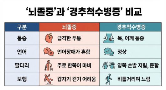 국내에서 1년 평균 약 11만여 명이 발생하는 뇌졸중은 뇌혈관이 막히거나 터지면서 뇌 조직 손상으로 인한 신체 마비가 오는 질환이다. 갑작스럽게 발생하는 경우가 많다. 반면 경추척수병증은 목뼈(경추)의 퇴행성 변화 즉, 디스크 탈출, 골극(뼈 돌기) 등으로 척수가 압박돼 발생한다. 또 뼈 뒤쪽 인대가 두꺼워져 척수신경을 압박하는 후종인대 골화증(OPLL)이다. 주로 중·장년층에서 서서히 진행되며 장기간 누적된 변화가 원인이다.