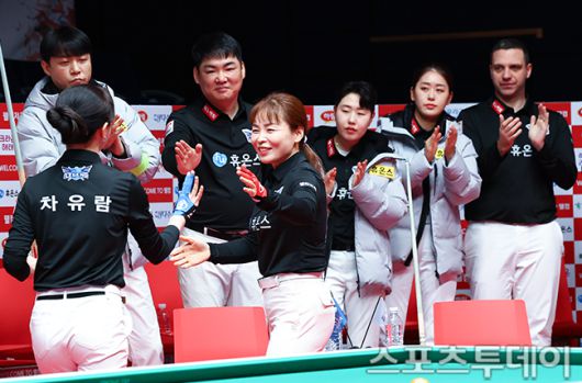 [고양(경기)=스포츠투데이 팽현준 기자] 7일 경기도 킨텍스 PBA스타디움에서 열린 웰컴저축은행 PBA 팀리그 2025-2026 5라운드 에스와이와 휴온스의 경기에서 휴온스 차유람과 이신영이 여자복식 승리를 따내고 있다. 2026.01.07.