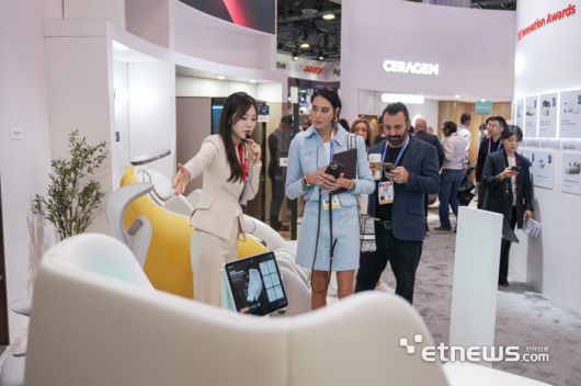 세계 최대 가전 전시회 'CES 2026'이 6일(현지시간) 미국 라스베이거스에서 개최됐다. 이날 영화 '탑건: 매버릭'에 출연한 모델 겸 배우 줄리아 루페티가 세라젬 전시관을 찾아 'AI 웰니스 홈' 전시를 둘러보고 있다. 'AI 웰니스 홈'은 거실o침실o욕실o자녀방 등 집 안 곳곳에 배치된 헬스케어 제품이 사용자의 생활 패턴과 상태를 인식하고 유기적으로 연결되도록 설계됐다.