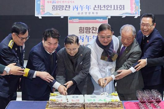 오세현 시장이 지역 인사들과 함께 신년인사회에서 떡케익 절단식을 하고 있다. |