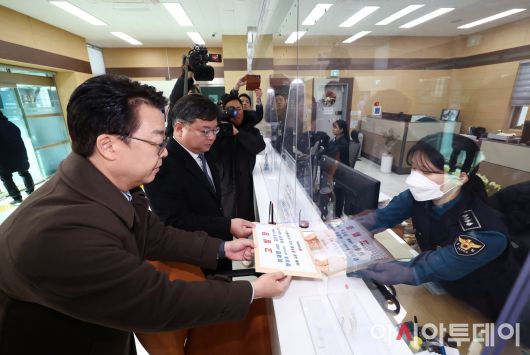 아시아투데이 박성일 기자 = 국민의힘 법률자문위원회 곽규택 위원장(왼쪽)과 김기윤 부위원장이 7일 서울 종로구 서울경찰청 민원실을 찾아 이재명 대통령과 김민석 국무총리, 정성호 법무부 장관, 박철우 서울중앙지검장에 대해 서해 피살 공무원 사건 관련 직권남용혐의로 고발장을 접수하고 있다. ⓒ "젊은 파워, 모바일 넘버원 아시아투데이"