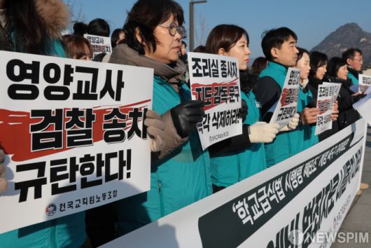 [서울=뉴스핌] 이길동 기자 = 전국교직원노동조합 관계자들이 7일 서울 종로구 정부서울청사 앞에서 '학교급식법 시행령' 개정 촉구 기자회견을 하고 있다. 2026.01.07 gdlee@newspim.com