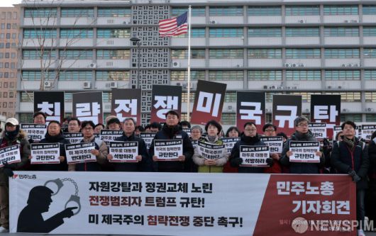 [서울=뉴스핌] 이길동 기자 =민주노총 조합원들이 7일 서울 종로구 주한 미국 대사관 앞에서 열린 '자원 강탈과 정권 교체 노린 전쟁 범죄자 트럼프 규탄! 미 제국주의 침략 전쟁 중단 촉구!' 기자회견을 하고 있다. 2026.01.07 gdlee@newspim.com