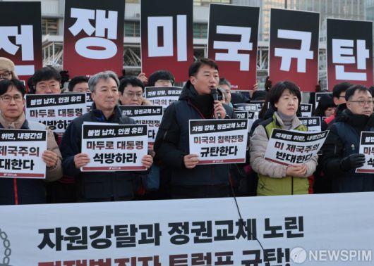 [서울=뉴스핌] 이길동 기자 = 양경수 민주노총 위원장이 7일 서울 종로구 주한 미국 대사관 앞에서 열린 '자원 강탈과 정권 교체 노린 전쟁 범죄자 트럼프 규탄! 미 제국주의 침략 전쟁 중단 촉구!' 기자회견에서 발언하고 있다. 2026.01.07 gdlee@newspim.com