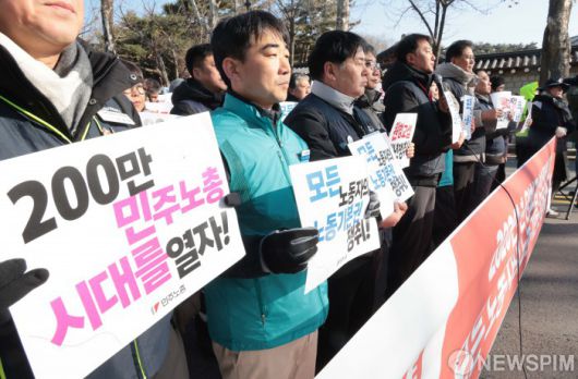 [서울=뉴스핌] 이길동 기자 = 양경수 민주노총 위원장이 7일 서울 종로구 청와대 앞에서 열린 '원청교섭 원년 선포! 모든 노동자의 노동기본권 쟁취! 2026년 민주노총 신년 기자회견'에서 발언하고 있다. 2026.01.07 gdlee@newspim.com