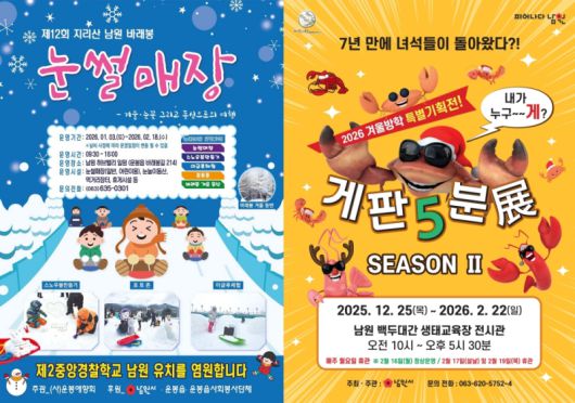 겨울방학을 맞아 남원 바래봉 일원에서 열리는 '지리산 남원 바래봉 눈썰매장'과 남원 백두대간 생태교육장 전시관에서 진행되는 겨울 특별기획전 '게판 5분展 시즌Ⅱ' 홍보 포스터 [사진=남원시] |
