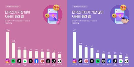 10대 이하 청소년 이용자들이 가장 많이 이용하는 SNS 앱 또한 인스타그램으로 412만명의 MAU를 기록했다. 지난달 10일 호주 정부가 세계 최초로 16세 미만 아동·청소년의 SNS 계정 사용을 금지한 데 이어 프랑스 정부도 올해 9월부터 15세 미만 청소년의 SNS 사용을 금지하는 법안을 추진하는 등 전 세계적으로 관련 움직임이 확산되는 가운데 국내에선 인스타그램이 가장 영향력 있는 SNS로 떠오른 모습이다.