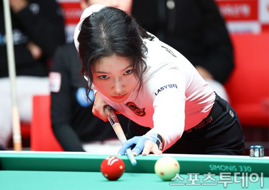 [고양(경기)=스포츠투데이 팽현준 기자] 7일 경기도 킨텍스 PBA스타디움에서 열린 웰컴저축은행 PBA 팀리그 2025-2026 5라운드 에스와이와 휴온스의 경기에서 에스와이 한지은이 샷을 하고 있다. 2026.01.07.