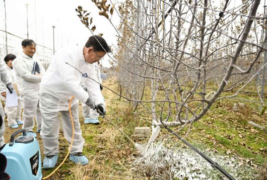 지난달 16일에 진행된 시연회에서 이승돈 농촌진흥청장이 전용 페인트 ‘숲으로트리가드’를 실제 사과나무에 도포하며 동해 예방 효과와 현장 적용성을 점검하고 있다. ⓒKCC |