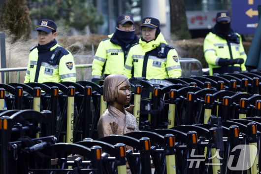 (서울=뉴스1) 박정호 기자 = 7일 낮 서울 종로구 중학동 옛 일본대사관 앞 평화의 소녀상 주위에서 경찰이 소녀상을 지키고 있다. 이재명 대통령은 전날 엑스(X·옛 트위터)에 "이런 얼빠진…"이라며 '평화의 소녀상'을 대상으로 철거 시위를 벌인 극우단체 위안부법폐지국민행동을 겨냥해 "사자명예훼손"이라고 강하게 비판했다. 2026.1.7/뉴스1