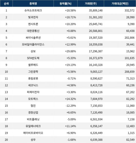 한편 거래량 상위 20위권 종목들은 휴림로봇(090710) ▼0.71%, 세코닉스(053450) ▲4.56%, 피제이전자(006140) ▲3.30%, 모트렉스(118990) ▲14.32%, 협진(138360) ▼12.29%, 경창산업(024910) ▲6.65%, 비트플래닛(049470) ▼5.09%, 유일에너테크(340930) ▲11.14%, 에이비프로바이오(195990) ▲6.90%, 성우(458650) ▼1.68% 등의 성적을 기록하고 있다.
