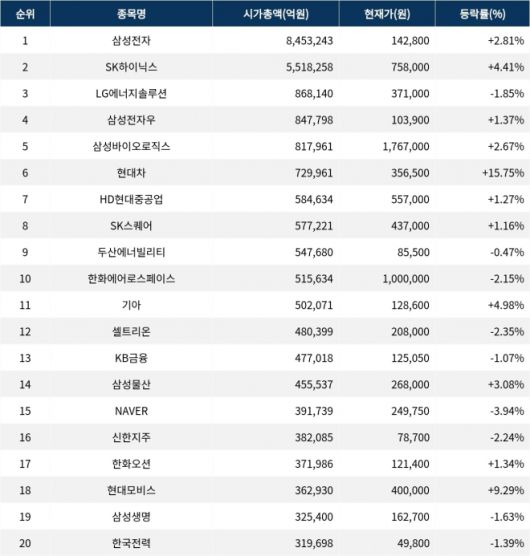 시가총액 상위 종목들은 대체로 엇갈린 주가 흐름을 보이며, 현대차가 두드러진 상승세를 기록하고 있다. 반면, NAVER는 상대적으로 큰 폭의 하락을 보이고 있다.