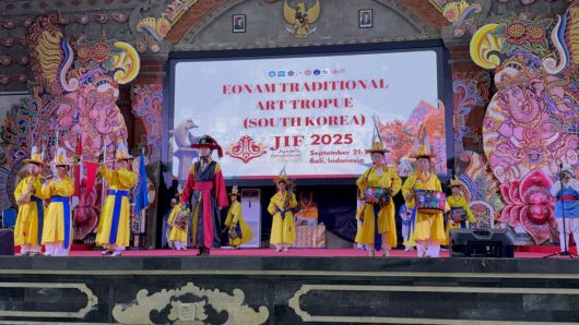 무대 위에서 전통 의상을 입은 사람들이 공연을 하고 있는 사진이다.무대 뒤편에는 ‘EONAM TRADITIONAL ART TROPHY (SOUTH KOREA) JIF 2025’라는 텍스트가 보인다. |