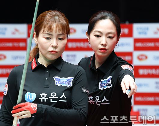 [고양(경기)=스포츠투데이 팽현준 기자] 7일 경기도 킨텍스 PBA스타디움에서 열린 웰컴저축은행 PBA 팀리그 2025-2026 5라운드 에스와이와 휴온스의 경기에서 휴온스 이신영과 차유람이 작전을 짜고 있다. 2026.01.07. [스포츠투데이 팽현준 기자 sports@stoo.com]