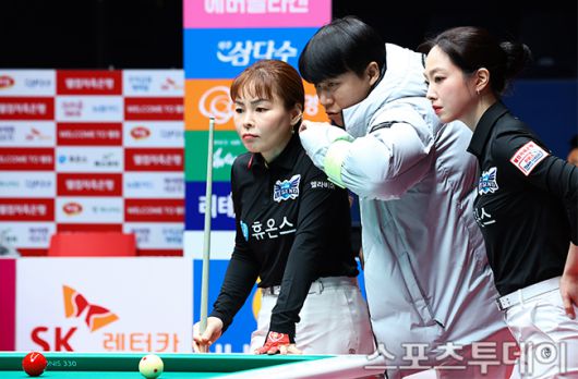[고양(경기)=스포츠투데이 팽현준 기자] 7일 경기도 킨텍스 PBA스타디움에서 열린 웰컴저축은행 PBA 팀리그 2025-2026 5라운드 에스와이와 휴온스의 경기에서 휴온스 이신영과 차유람이 주장 최성원과 작전타임을 갖고 있다. 2026.01.07. [스포츠투데이 팽현준 기자 sports@stoo.com]