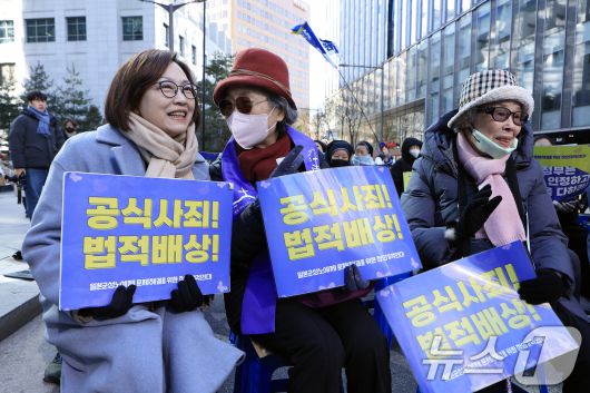 (서울=뉴스1) 박정호 기자 = 이나영 정의기억연대 이사장(왼쪽)이 7일 낮 서울 종로구 중학동 옛 일본대사관 앞에서 열린 1734차 일본군 성노예제 문제해결을 위한 수요시위에 참여한 초기 정대협(한국정신대문제대책협의회) 활동가 어르신들과 대화를 나누고 있다. 2026.1.7/뉴스1