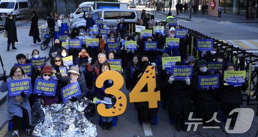 (서울=뉴스1) 박정호 기자 = 이나영 정의기억연대 이사장(왼쪽)이 7일 낮 서울 종로구 중학동 옛 일본대사관 앞에서 열린 1734차 일본군 성노예제 문제해결을 위한 수요시위에 참여한 초기 정대협(한국정신대문제대책협의회) 활동가 어르신들과 함께 구호를 외치고 있다. 2026.1.7/뉴스1