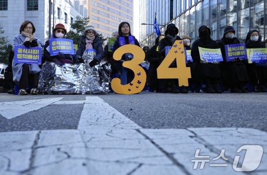 (서울=뉴스1) 박정호 기자 = 이나영 정의기억연대 이사장(왼쪽)이 7일 낮 서울 종로구 중학동 옛 일본대사관 앞에서 열린 1734차 일본군 성노예제 문제해결을 위한 수요시위에 참여한 초기 정대협(한국정신대문제대책협의회) 활동가 어르신들과 대화를 나누고 있다. 2026.1.7/뉴스1