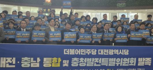 민주당 대전시당은 이날 대전시의회에서 대전·충남 통합 및 충청 발전특별위원회 발족 기자회견을 가졌다. 참석자들은 행정통합을 지방 주도 성장의 선언 등으로 평가하며 속도감 있는 추진을 강조했다.