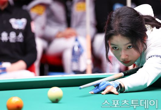 [고양(경기)=스포츠투데이 팽현준 기자] 7일 경기도 킨텍스 PBA스타디움에서 열린 웰컴저축은행 PBA 팀리그 2025-2026 5라운드 에스와이와 휴온스의 경기에서 에스와이 한지은이 샷을 하고 있다. 2026.01.07. [스포츠투데이 팽현준 기자 sports@stoo.com]
