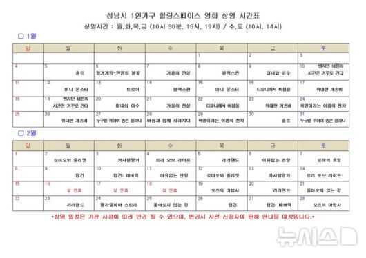 [성남=뉴시스]성남시 1인가구 힐링스페이스 1~2월 영화 상영 시간표(사진=성남시 제공)2026.01.07.photo@newsis.com |