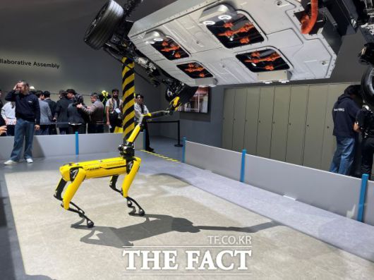 부스에서 무엇보다 주목받은 제품은 4족 보행 로봇 '스팟'이다. 스팟 AI 키퍼는 엑스블 숄더(현대차그룹 산업용 착용로봇)를 착용한 직원이 차량을 조립하면 직접 검수하는 모습을 시연했다. 사람 역할을 대체해 효율성을 높이는 셈이다.