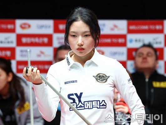 [고양(경기)=스포츠투데이 팽현준 기자] 7일 경기도 킨텍스 PBA스타디움에서 열린 웰컴저축은행 PBA 팀리그 2025-2026 5라운드 에스와이와 휴온스의 경기에서 에스와이 한지은이 샷을 준비하고 있다. 2026.01.07. [스포츠투데이 팽현준 기자 sports@stoo.com]